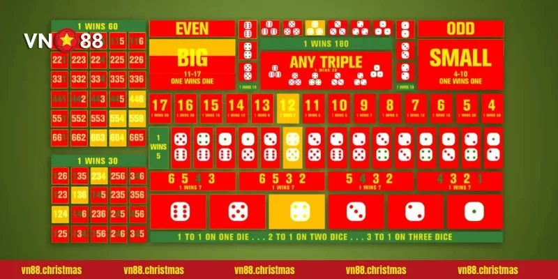Nhà cái VN88 cung cấp hơn 50 loại cược khác nhau, chia thành các nhóm chính: cược Tổng Điểm (3-18), cược Tài/Xỉu, cược Đôi, cược Bộ Đôi, cược Cụm Số,… Mỗi loại cược có tỷ lệ trả thưởng riêng, từ 1:1 cho cược Tài/Xỉu đơn giản đến 1:180 đối với cược Cụm Số khó trúng nhưng siêu lợi nhuận.
